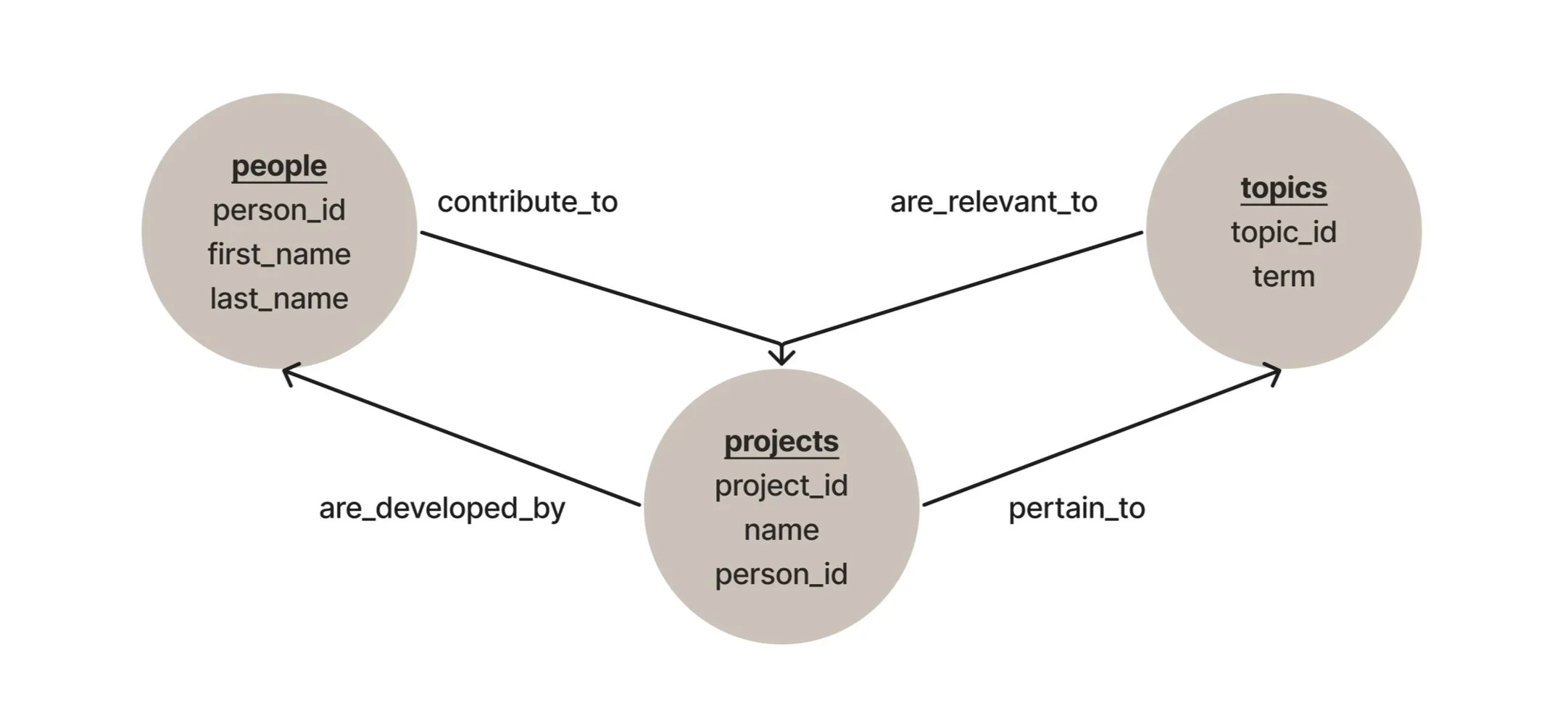 Following data collection, the lead archivists and I contemplated whether the data would be represented in a more traditional graph or chart, but based on the complex relationships between people, projects and topics we determined that a network graph would best depict the information derived from the reviews. Because of this the data model for the visualization resembles more of a graph model rather than a traditional relational database.