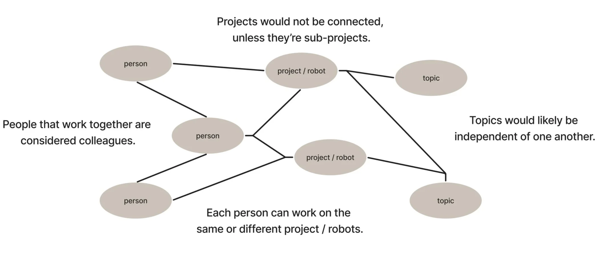 The metadata utilized in this project was derived from CMU’s Robotics Institute’s Research Reviews, which were digitized as a part of the Robot Archive. As these documents were recorded certain relationships became more distinct, such as the relationships between the people, or colleagues, that contributed to the same robotics projects, and recurring research topics that related to the projects (example included below). As the data collection phase came to a close we decided to focus the project on the people, projects, and topics, which is captured in the early sketch of metadata’s relationships included below.
