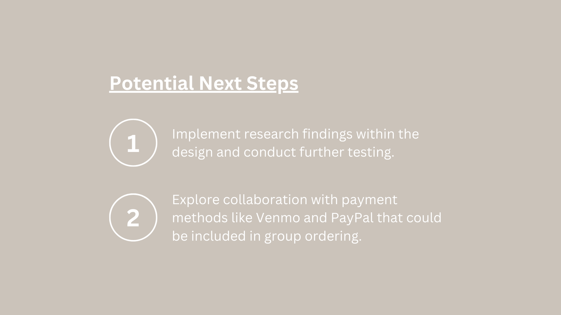 In light of our research we chose to expand the ordering and payment process by adding the option of group ordering during checkout, as well as introducing dietary restrictions within the preferences options. Guerrero and Guthan (my teammates) took the lead in conceptualizing, sketching and developing the screens for these functions and added them to the prototype we utilized for usability testing.